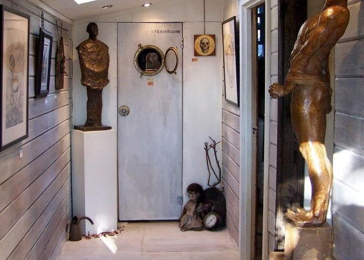 The eventually finished living room was soon filled with art and antique furnishings. An opening in a wall encouraged one to look through to discover something new. A ladder encouraged one to explore. Everywhere, art was built into the walls. Found objects and salvaged materials like pipes, valves and tools were functional, interactive and decorative. The result was a home that is eclectic yet efficient, and an intriguing work of evolving art.